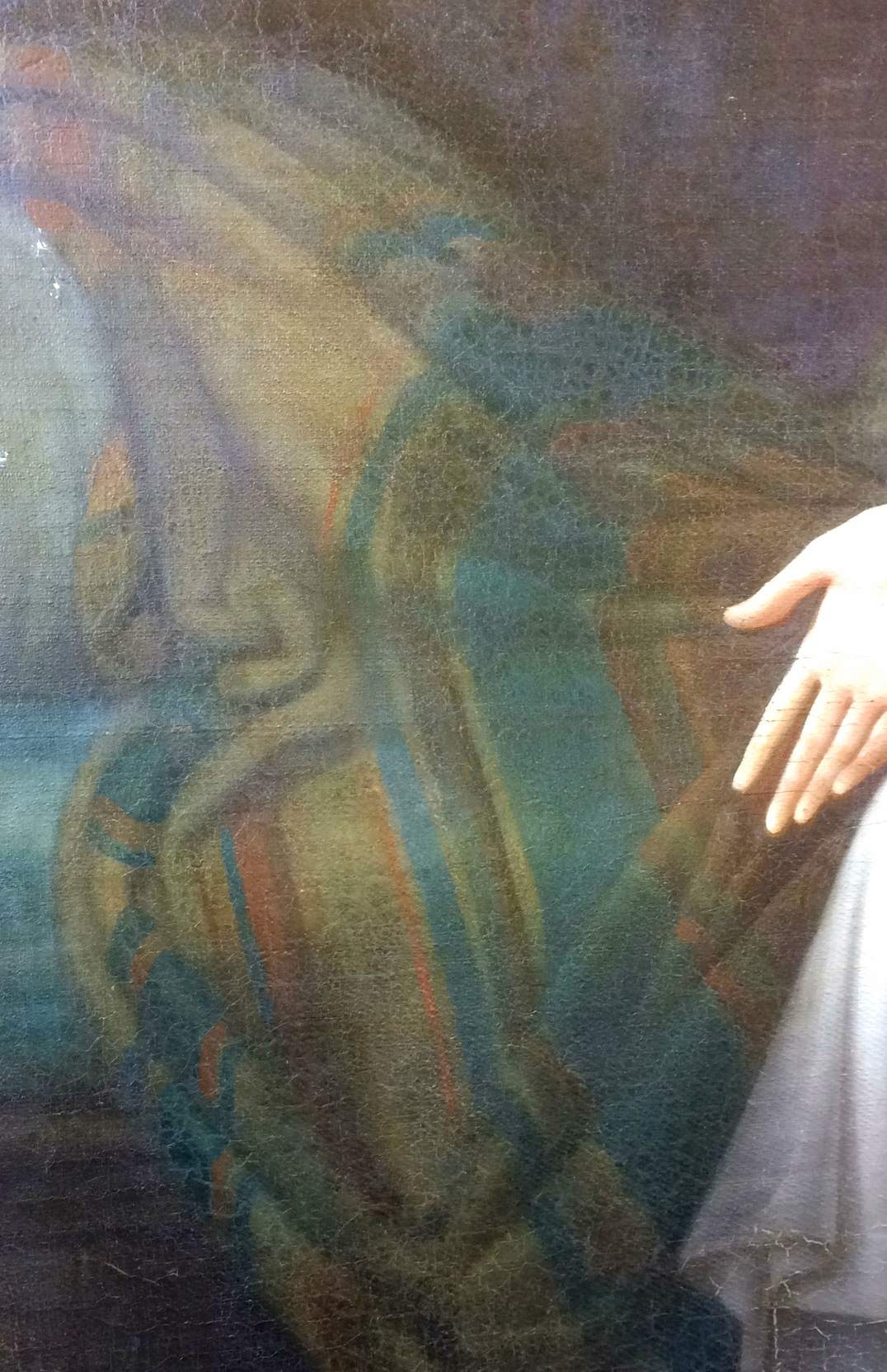Vous pouvez voir ce dernier lever un regard pathétique vers Saint Michel, toutes ailes déployées, qui le tient fermement par les cheveux tout en le transperçant de sa lance, un pied posé sur ses reins pour l’immobiliser.
