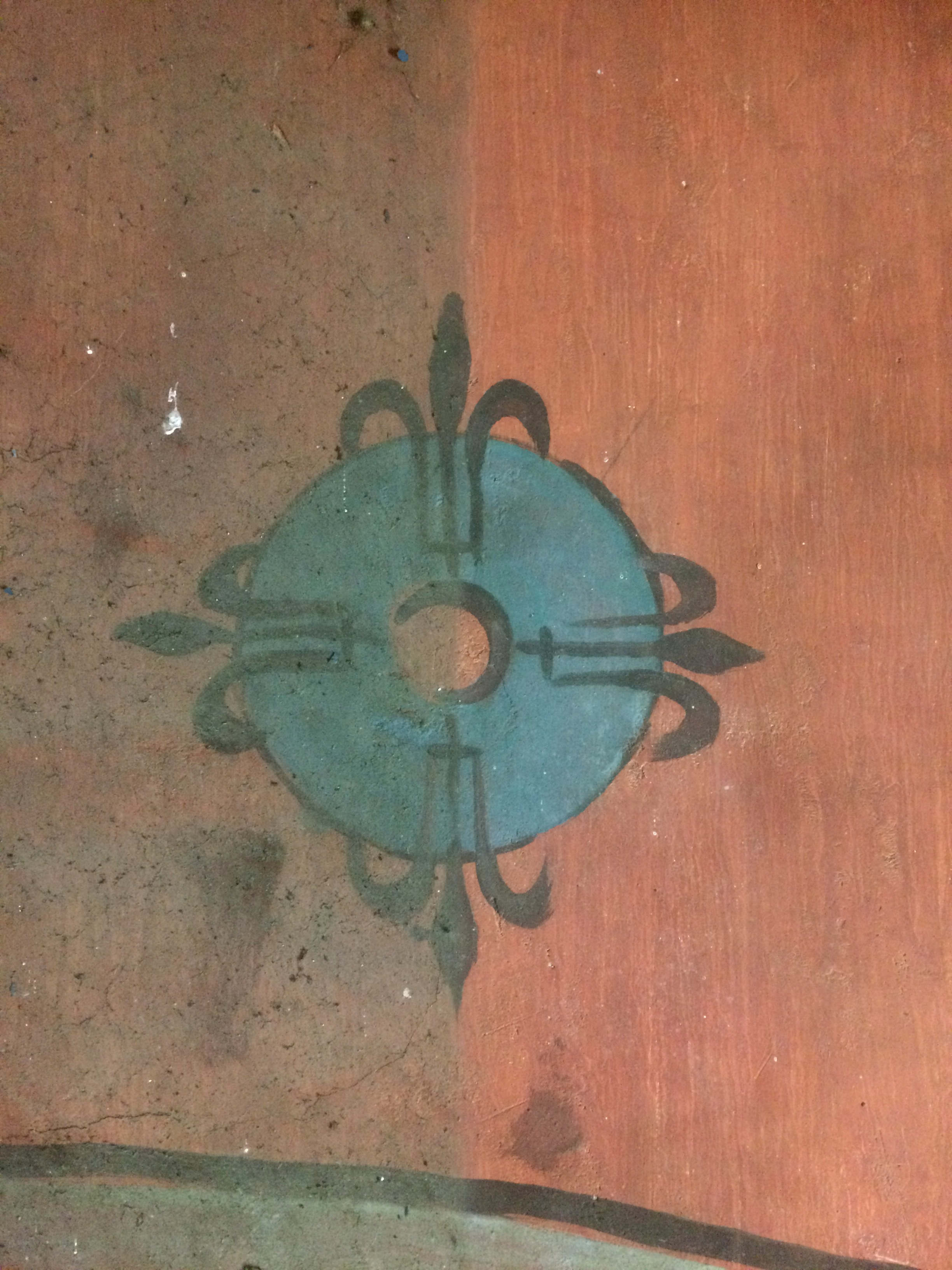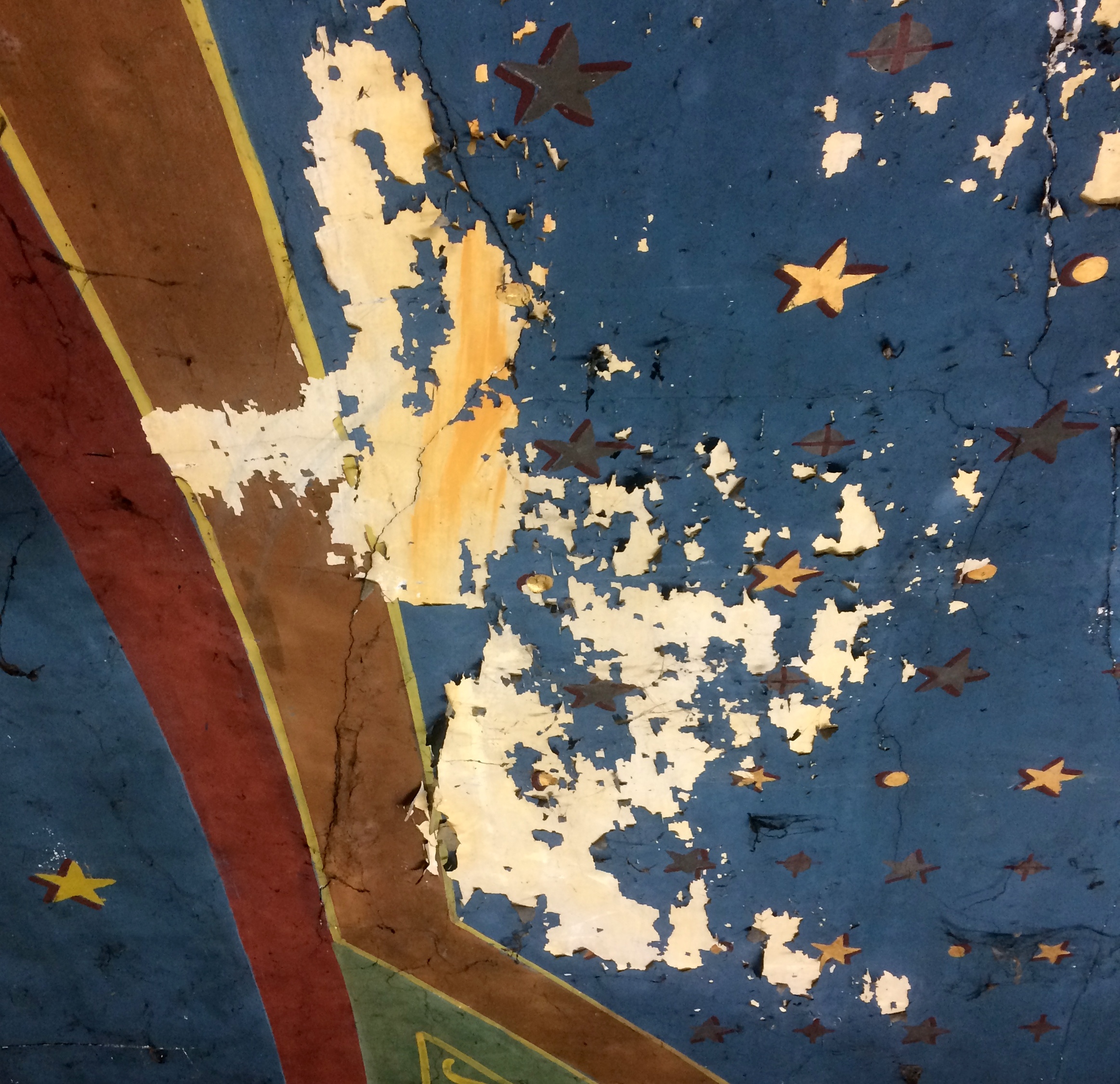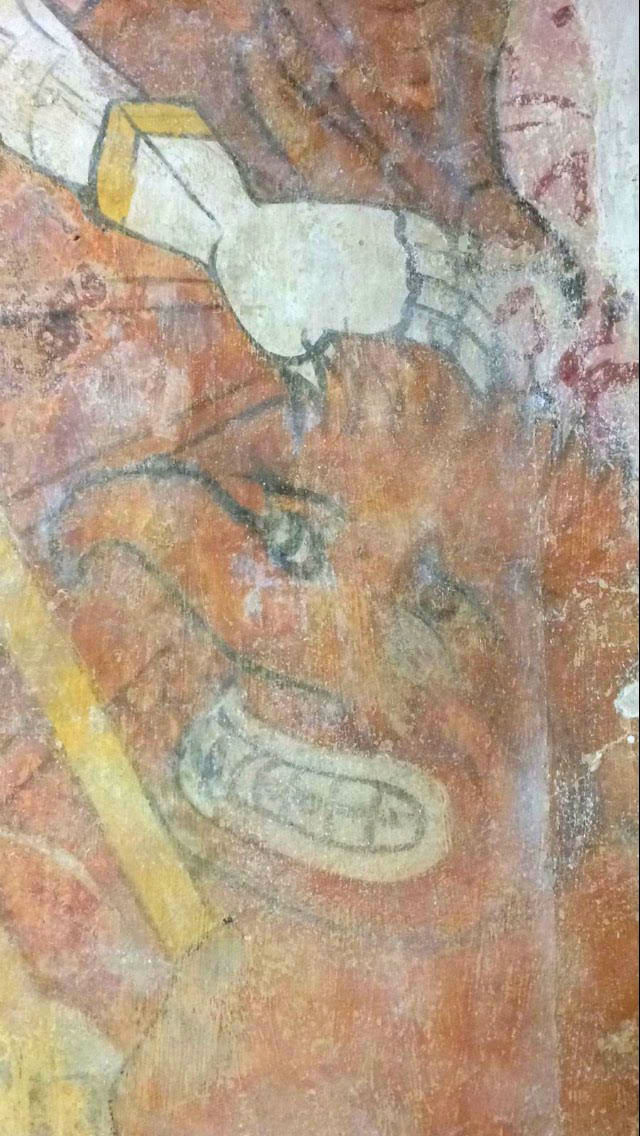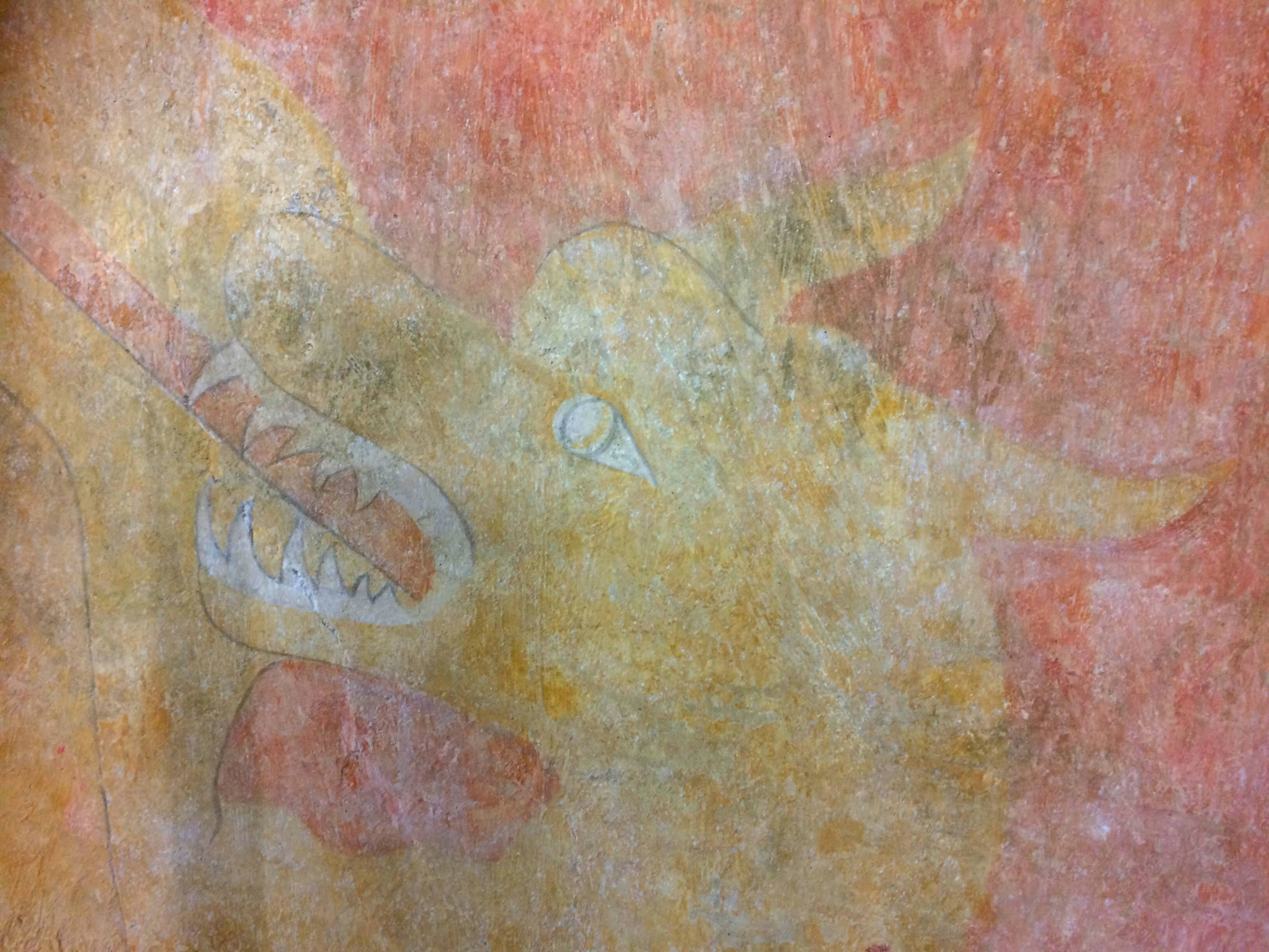 L’image n’est pas très claire mais c’est Sainte Marguerite qui ouvre le bal lorsqu’on entre dans l’église. Vous la devinez à gauche du dragon, brandissant vers lui le crucifix avec lequel elle vient de lui percer le ventre pour s’en dégager. Un phylactère sous l’animal mis à mal le décrit comme : “Le dragon râlant”. Il y a peut être de quoi il faut dire…