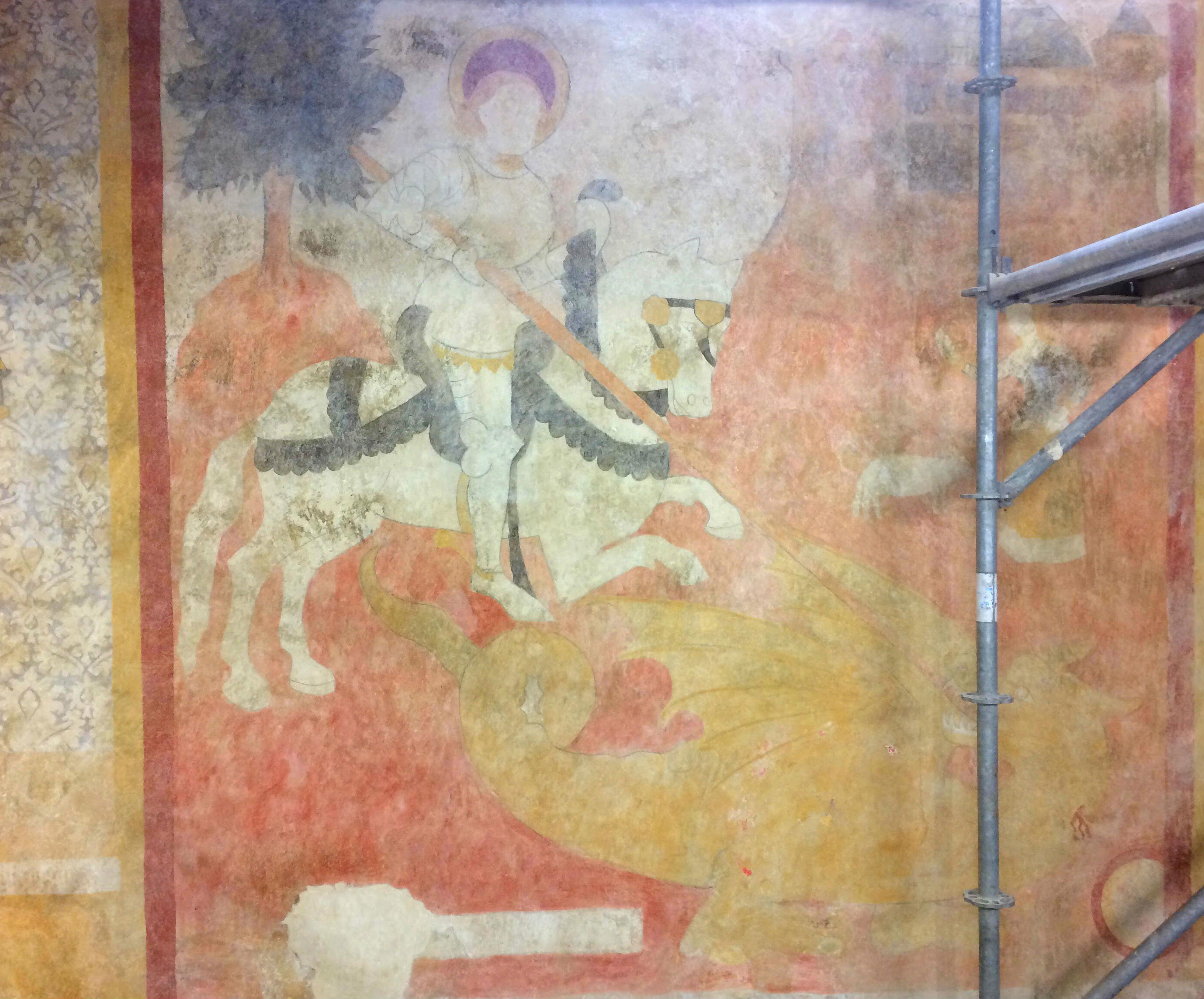 Le dernier, et non le moindre, est Saint Georges, qui s’élance sur son valeureux destrier pour sauver une belle princesse (dissimulée par l’échafaudage). Le dragon est à terre et avale la lance de Saint Georges qui le transperce de part en part.